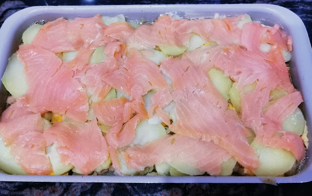 Tapamos el conjunto con otra capa fina de patatas. Sobre ella repartimos el salmón ahumado y terminamos con otra capa de patatas